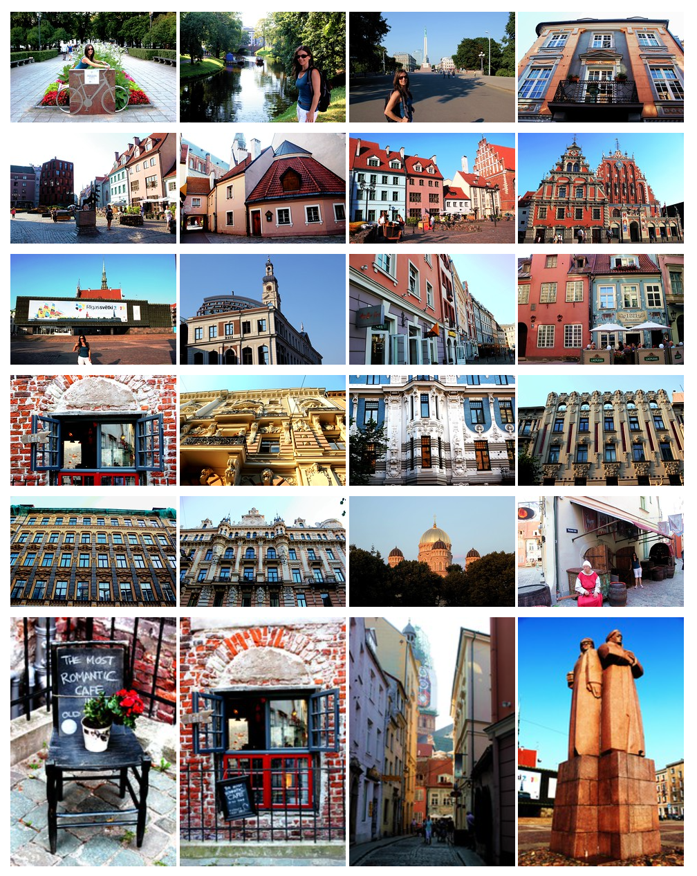 Plaza del Ayuntamiento; Casa de las Cabezas Negras; Iglesia de San Pedro; Catedral del Domo de Riga; Ópera Nacional; Monumento a la Libertad; Plaza de Livu; Plaza de la Catedral; Museo de Arte; Bolsa de Riga; Museo de Historia y Navegación de Riga; Catedral de San Jacobo; grupo de casas Tres Hermanos; Castillo de Riga; Torre del Polvorón; Catedral de la Natividad de Cristo; Teatro Nacional de Letonia, Museo Nacional de Arte de Letonia; Puerta Sueca; Barrio peatonal “El Bazar de Bergs”; Mercado Central; Barrio creativo Spikeri, Barrio de Moscú.