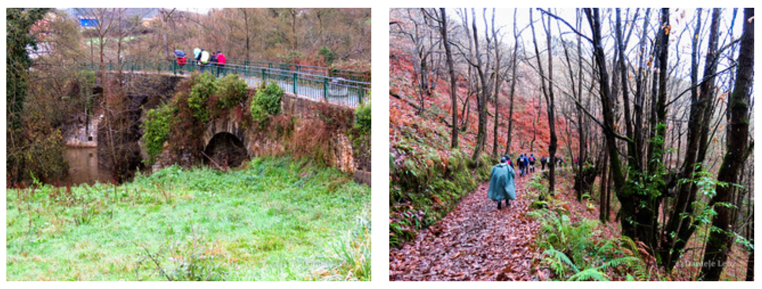 Gallegos tampoco cuenta con servicios para el peregrino, lo atravesamos y a la salida tomamos a la derecha por un camino que nos lleva a El Castañéu del Soldáu, un bosque de castaños y robles en las riberas del Nora.