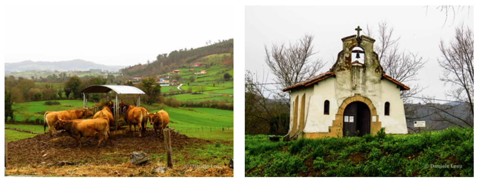 Tomamos un camino que aparece a la derecha a la salida del pueblo, por unos parajes de campos, bosquetes y de gran belleza que nos llevará, por la falda de la sierra del Naranco, hasta Llampaxuga y su Capilla del Carmen.