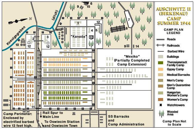 (D) Apartadero de ferrocarril y plataforma de descarga construida en Auschwitz II – Birkenau en mayo de 1944, principalmente para procesar los judíos destinados a ser enviados a Auschwitz en las grandes deportaciones de Hungría. Judíos polacos también fueron traídos aquí cuando las SS liquidó los guetos de la Polonia ocupada por los alemanes. Después de la selección, llevada a cabo aquí por los doctores de las SS, la mayoría de los judíos eran enviados de inmediato a la muerte en las cámaras de gas adyacentes. El transporte de etnias polacas también llegaba aquí, sobre todo después de la sublevación de Varsovia en agosto de 1944.