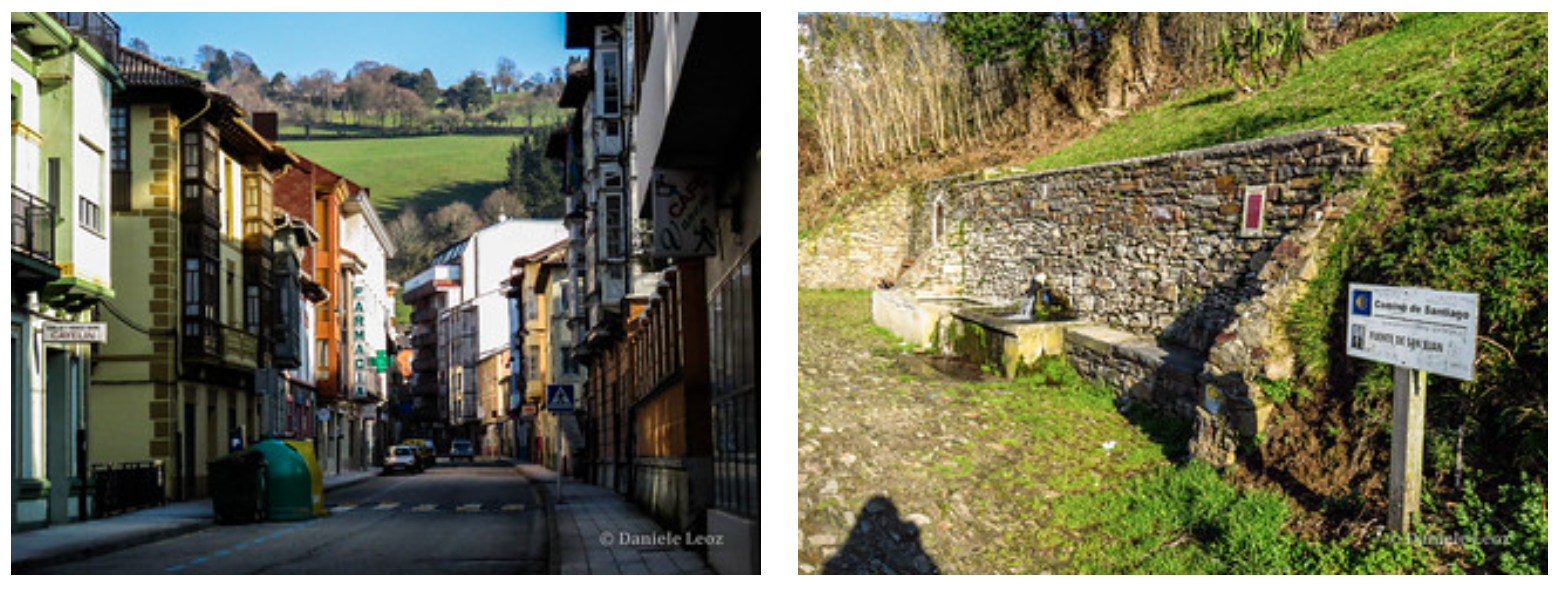 Pasamos delante de la Fuente de San Juan, donde se pueden llenar las botellas o sentarse en los bancos que están puestos allí junto a las mesas, para admirar el paisaje. Seguimos atravesando el barrio de la Fuente por el camino de la Sierra. Es un camino muy bonito, pavimentado y protegido por un rústico vallado de madera. Al terminar el pavimento, a mano izquierda, encontramos una senda que tomamos para cruzar el regueiro de Robleu.