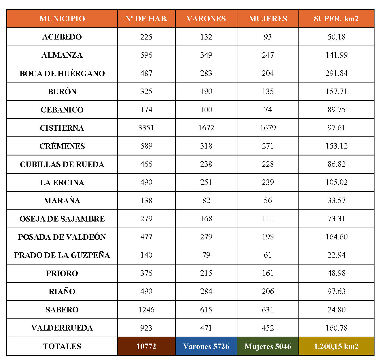 A excepción de los municipio de Cistierna y Sabero que cuentan con mayoría de mujeres es significativo que el número de mujeres sea inferior al de los hombres, indicativo de lo poco atractivo que resulta la vida para las mujeres en esta comarca y las dificultades añadidas para su integración en el mercado laboral y la conciliación familiar con que se tropiezan en el mundo rural.