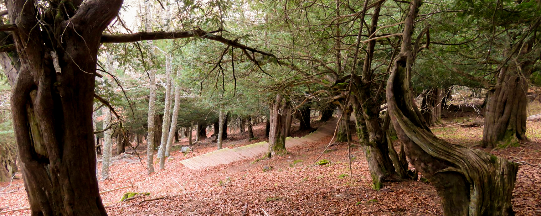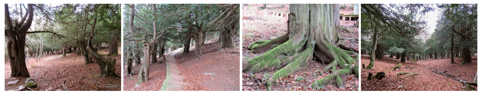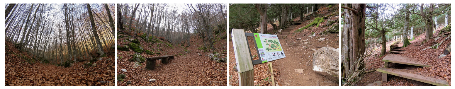 El sendero remonta la empinada ladera por una vaguada y luego serpentea entre los tejos centenarios, con rincones verdaderamente encantadores y misteriosos, muy apropiados para ambientar cuentos y leyendas.