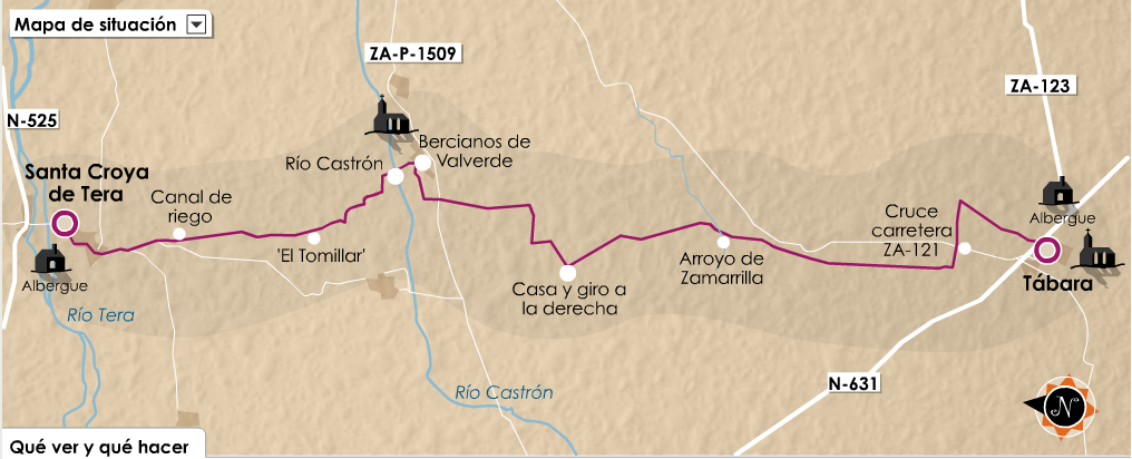 Desde el albergue de Tábara hay dos alternativas para comenzar la etapa. La más sencilla es seguir las flechas que nos llevan a tomar la ZA-121 en dirección a Pueblica de Valverde. De esta forma, pasado el punto kilométrico uno, se deja el asfalto por la izquierda para coger un camino.