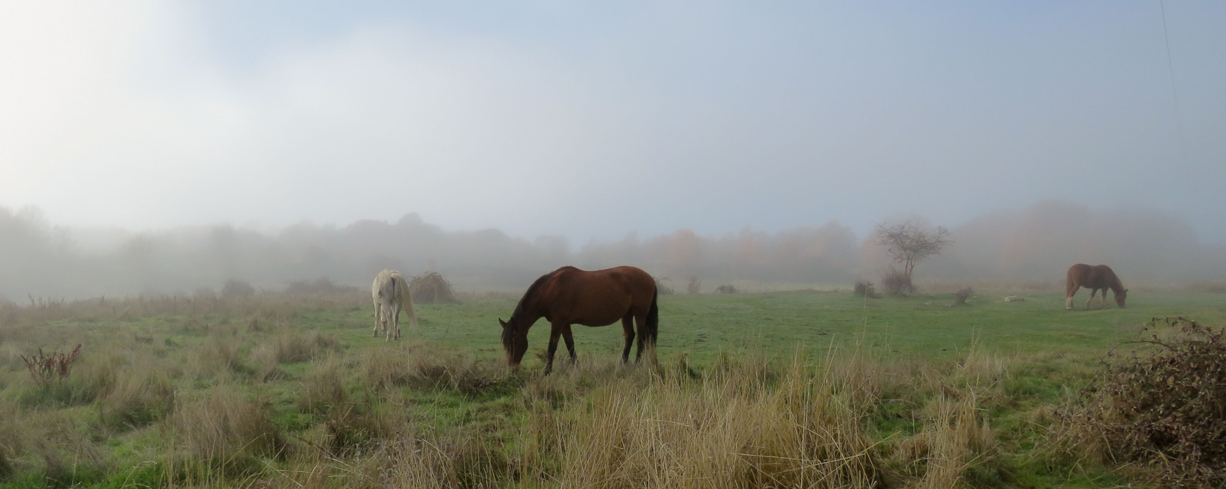 Abandonamos el pueblo y sus casas blasonadas a través de la carretera que dejamos por la izquierda para tomar la pista que nos llevó, entre prados, a cruzar un túnel y luego la A-52, Autovía de las Rías Baixas, hasta que finalmente llegamos a Asturianos escoltados por preciosos caballos que, junto a la niebla baja que nos envolvía, configuraba un panorama de lo más bucólico.