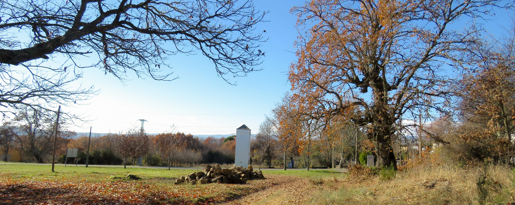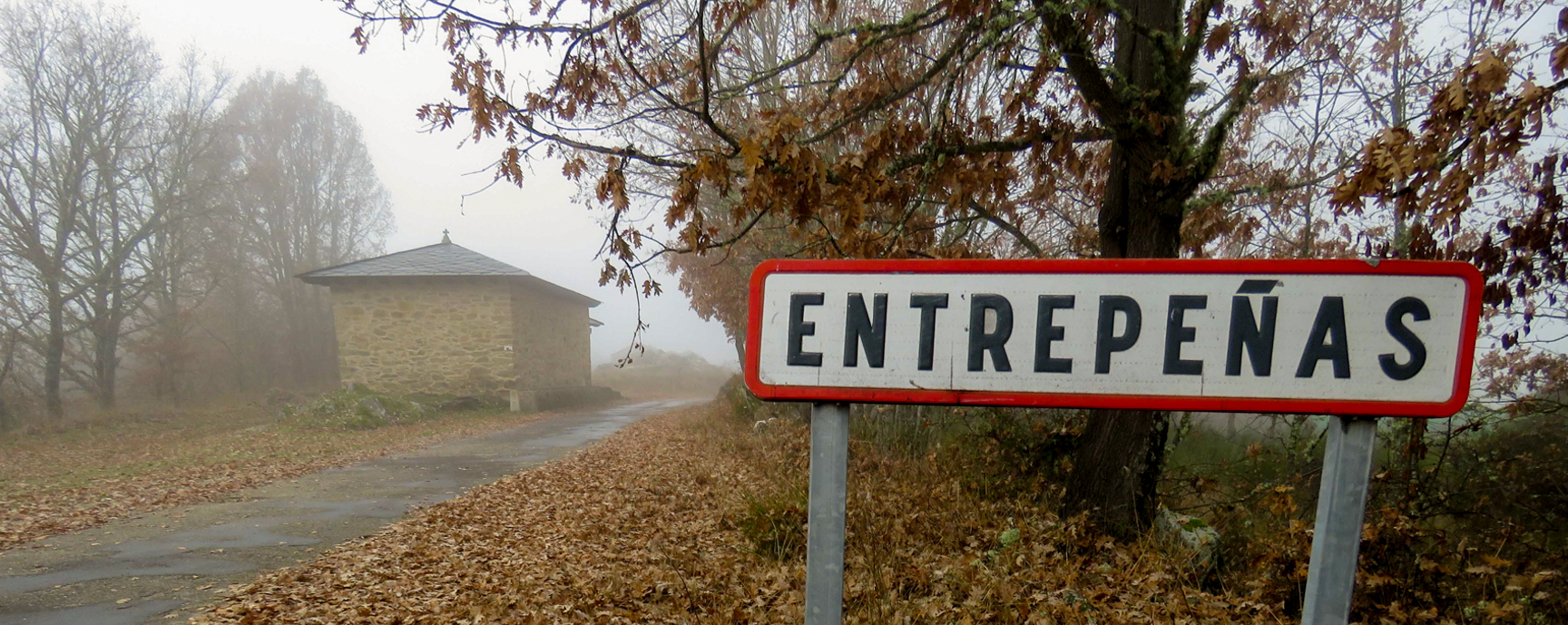 Pasamos por el arroyo de la Calzada y 1,5 kilómetros después cruzamos la carretera ZA-P-2639 y cogemos un camino, adornado por bonitos cruceros, que tras 600 metros revierte en asfalto y conduce a la entrada de Entrepeñas, donde está la ermita de Santo Cristo y el mojón del pueblo que nos recibe con el siguiente mensaje: