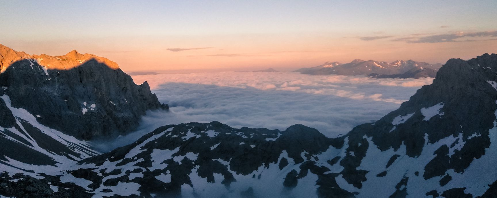 El 22 junio, tomé el teleférico en Fuente Dé a última hora; tras veinte minutos de caminada hacia Cabaña Verónica, en un tramo conocido como La Vueltona y entre una niebla espesa pude calzarme las botas y los esquíes con los que ya alcancé el Refugio.