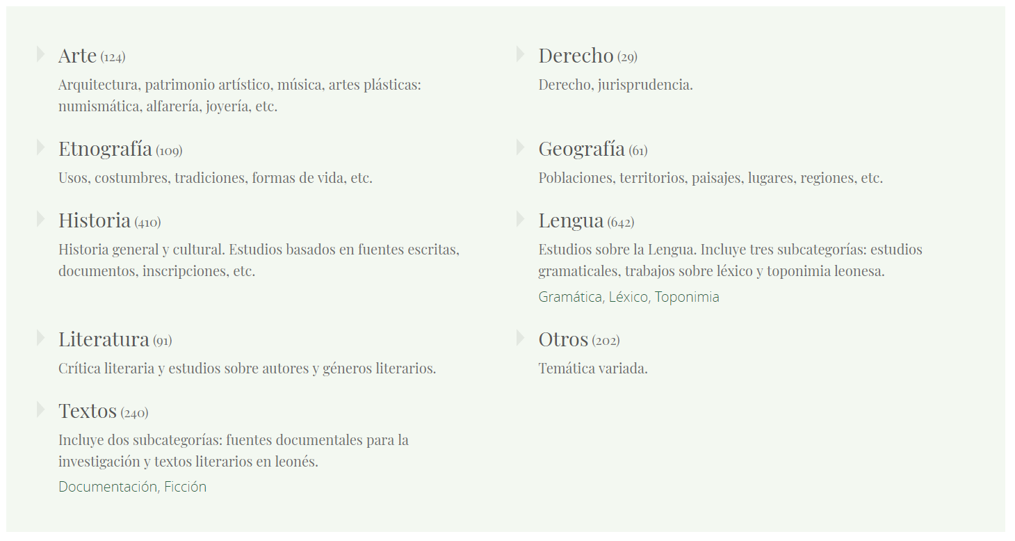 El directorio de bibliografía leonesa dispone en su página de inicio algunas categorías predeterminadas para facilitar la búsqueda de las obras.