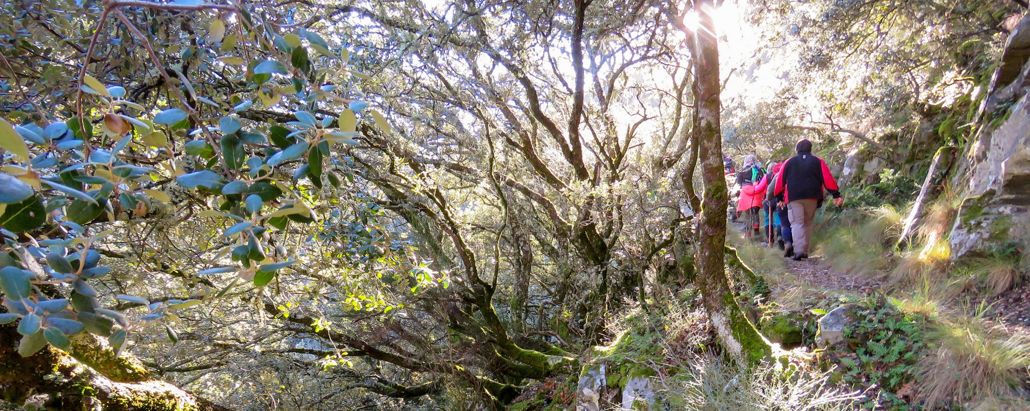 Tras cruzar otro puente de troncos serrados a la mitad pasamos por un desmoronamiento de tierra y nos adentramos nuevamente a un bosque de encinas, robles y alisos adornados por musgos, líquenes y hiedra.