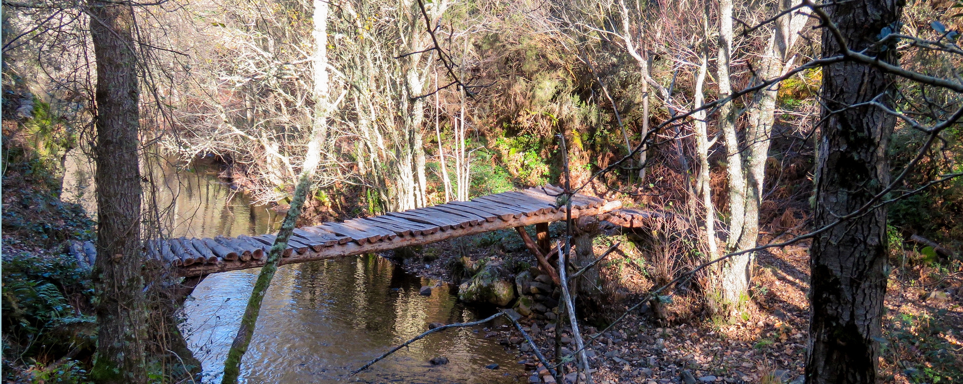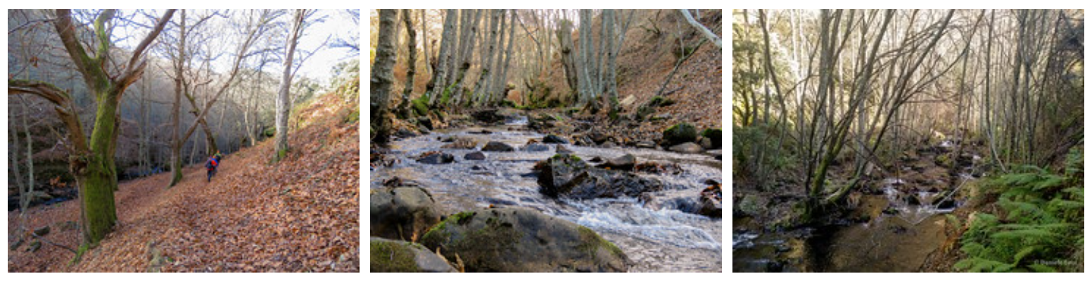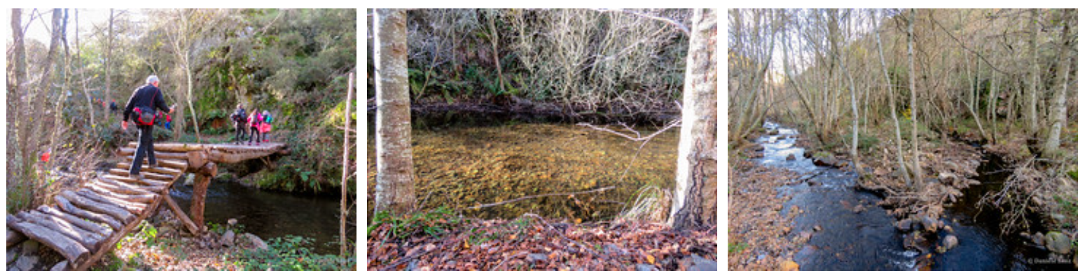 Salvamos tramos por zonas rocosas y por bosques y pasamos por otro puente artesanal para cruzar otro arroyo que nos llevará a un terreno de piedras, troncos, y hojas en otoño, que forman una magnífica estampa fotográfica.