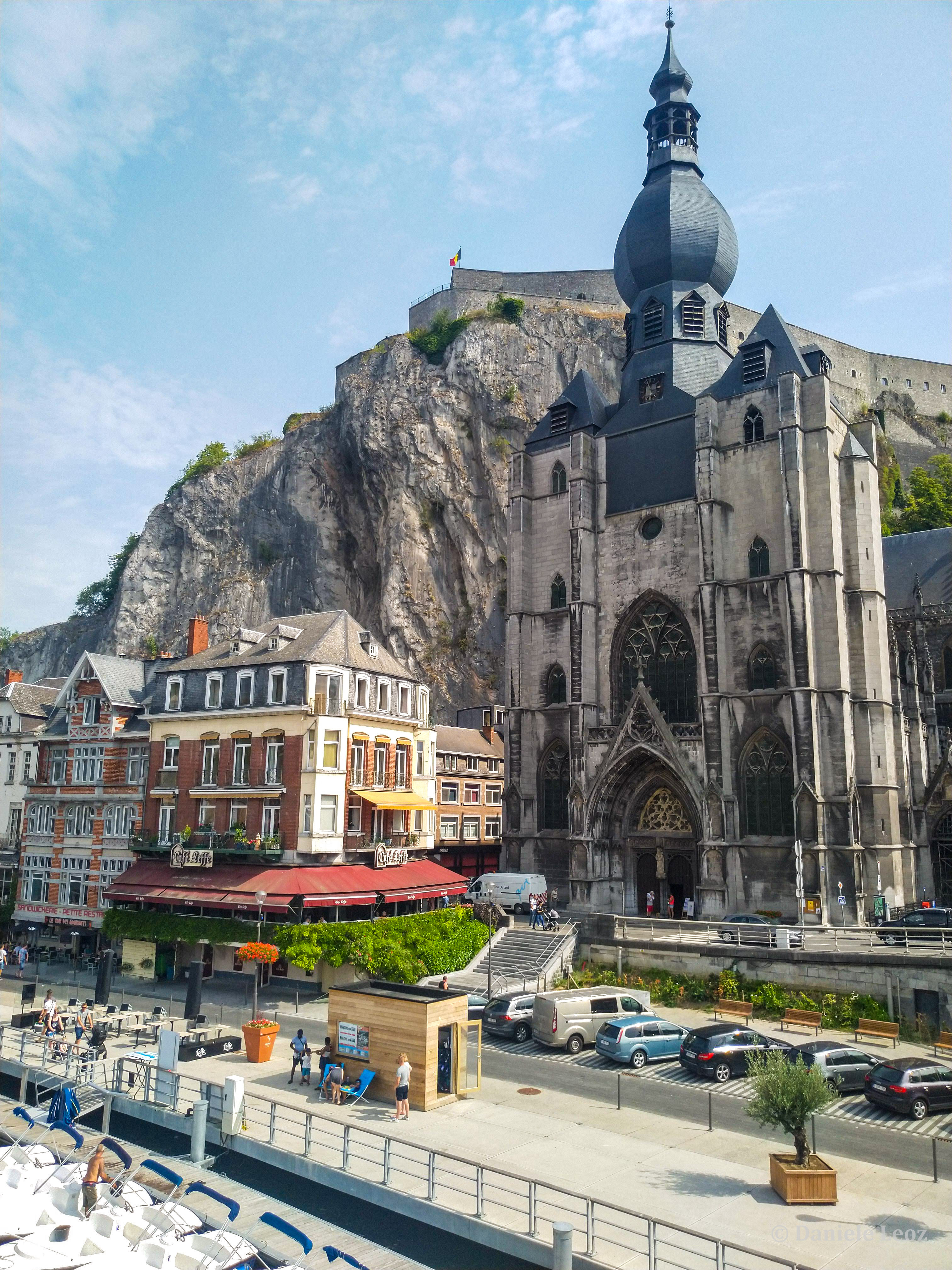 Aunque la estructura que vemos hoy es fruto de la reforma realizada en 1227, el campanario en forma de cebolla que se encuentra en el centro de la iglesia fecha del año de 1556. El interior del templo está distribuido en tres naves, una capilla con pila bautismal (1472) y pórtico románico (siglo XIII). Saliendo de la Colegiata echamos el ojo arriba y vislumbramos la Ciudadela de Dinant.