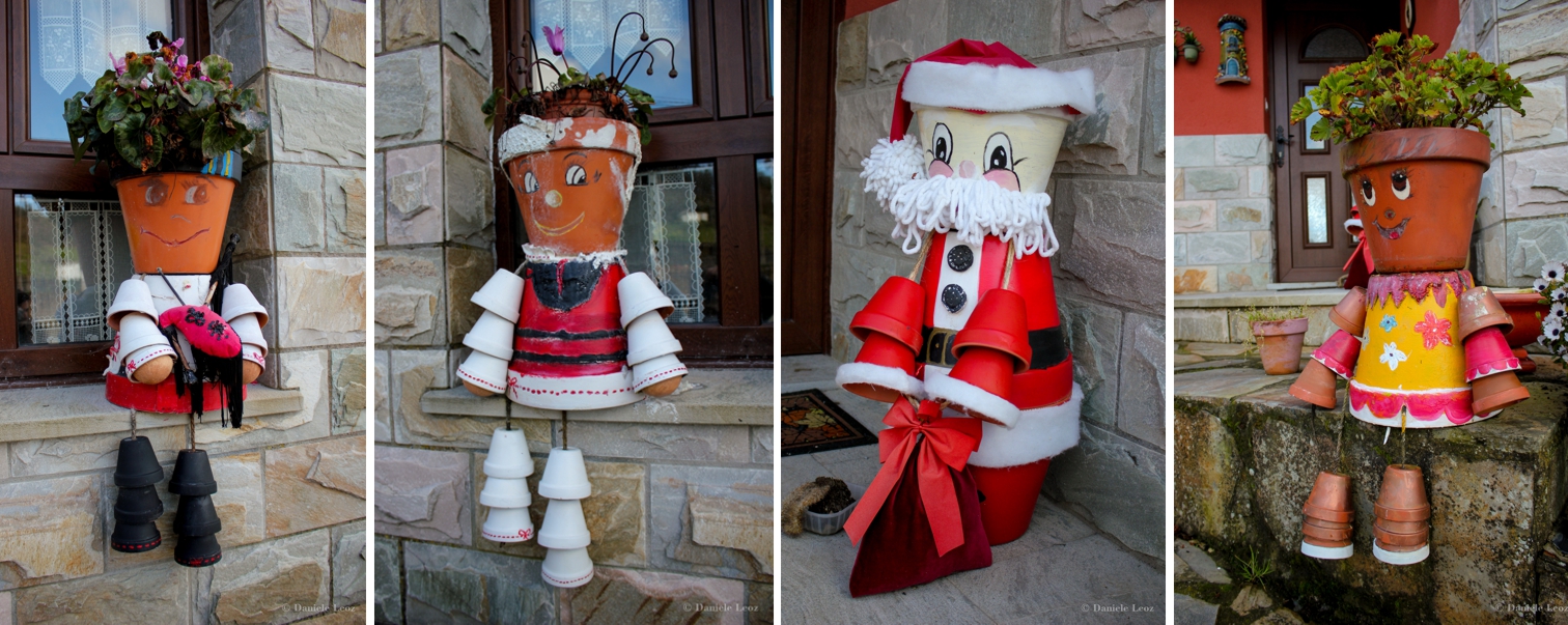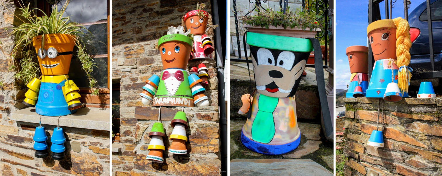 Las ventanas y los jardines de las casas están habitadas por muñecos de lo más simpáticos hechos con macetas pintadas con caretos y personajes divertidos.