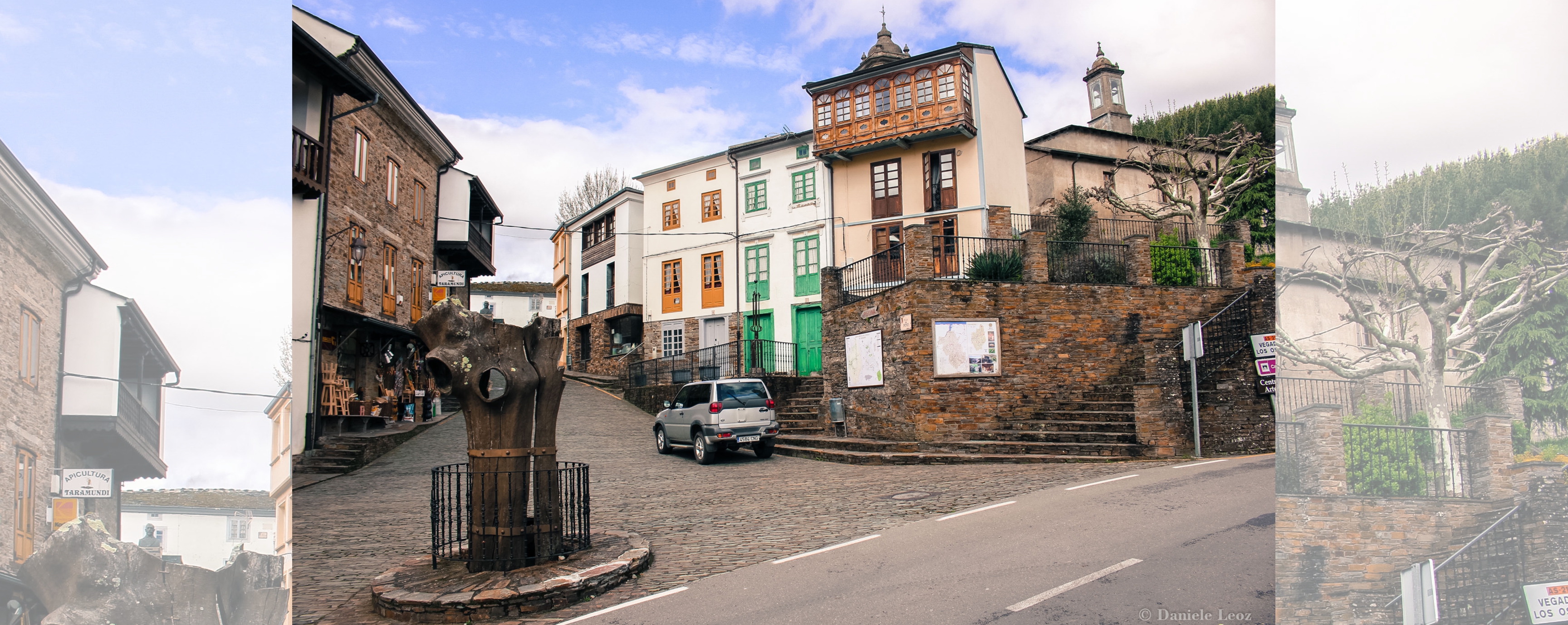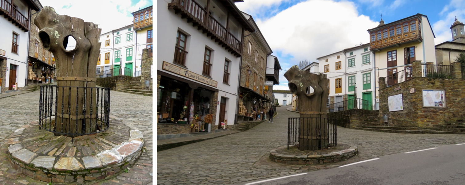 Llegando a la villa lo primero que nos ha llamado la atención fue una escultura de un roble (carbayo) en el medio de una mini rotonda. Es una talla de madera creada por el escultor Legazpi a partir del roble centenario original (cortado en 1998).