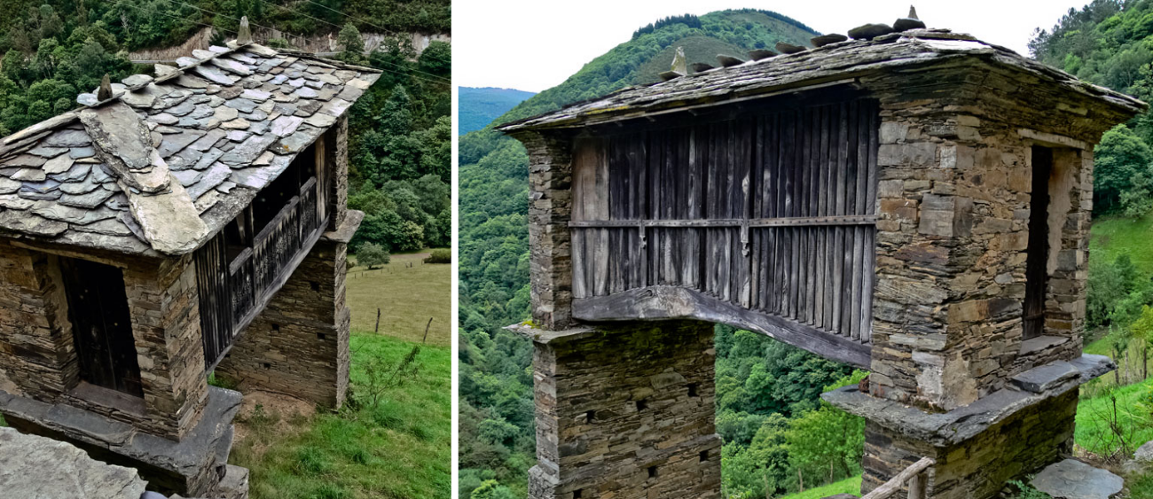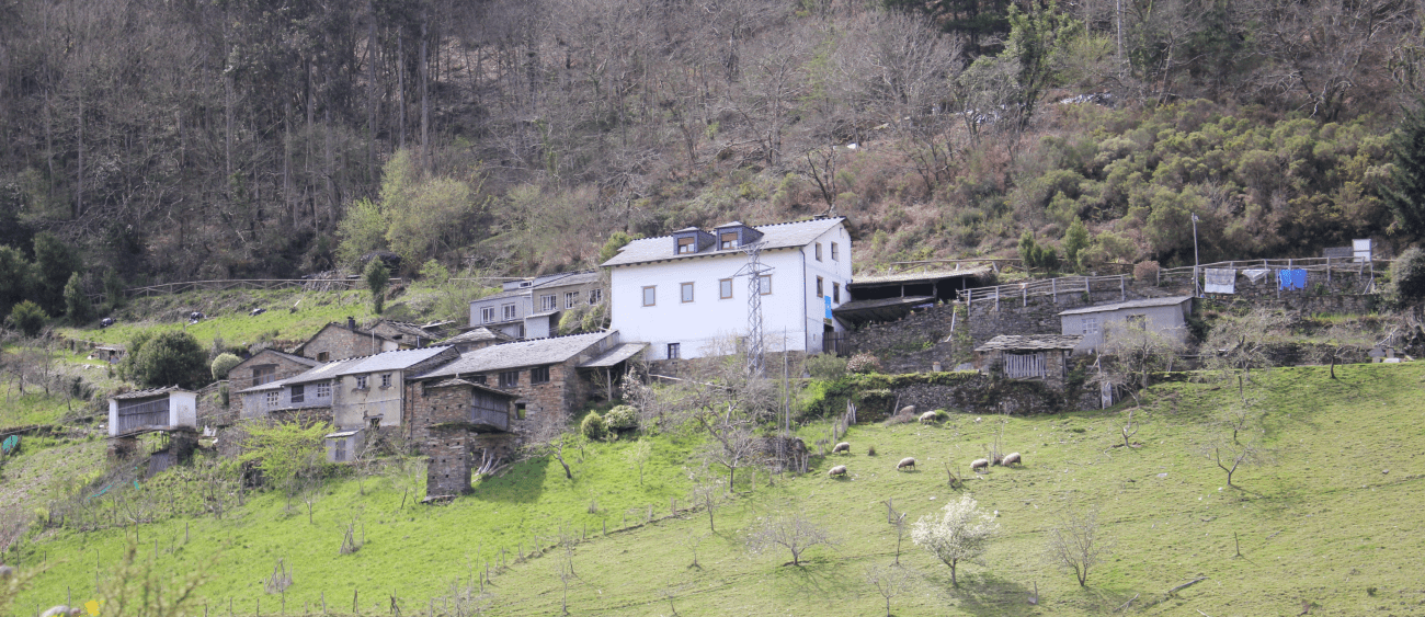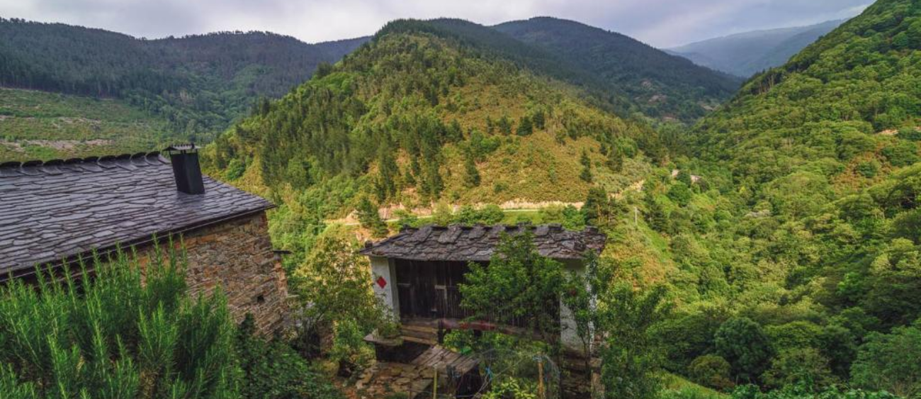La aldea también presume de hórreo y paneras —estructuras elevadas utilizadas para almacenar grano—, y caminos de piedra que serpentean entre los campos.