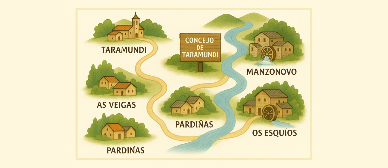 En la actualidad el concejo de Taramundi está formado de 54 aldeas distribuidas en cuatro parroquias: Taramundi, Ouría, Bres y Veigas.
